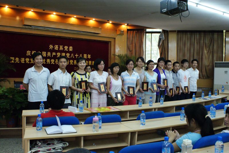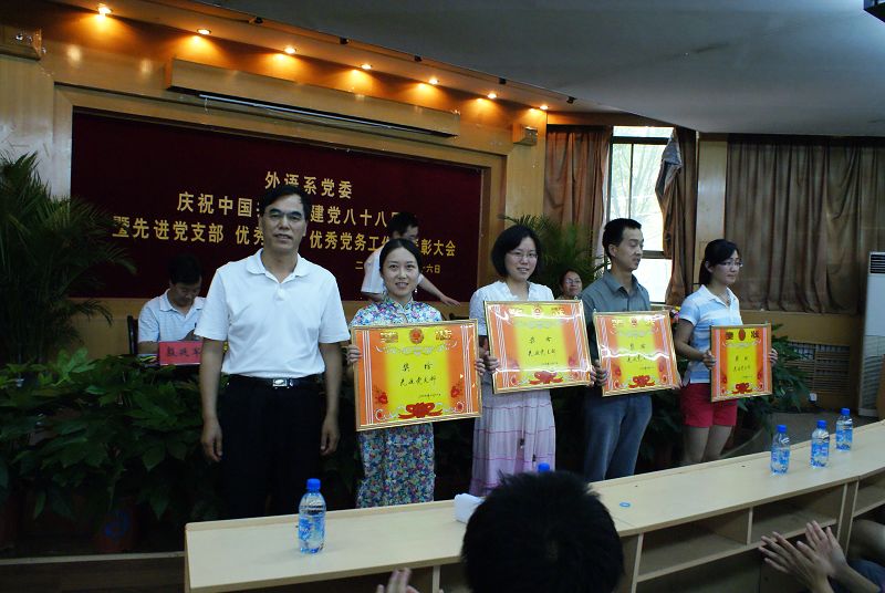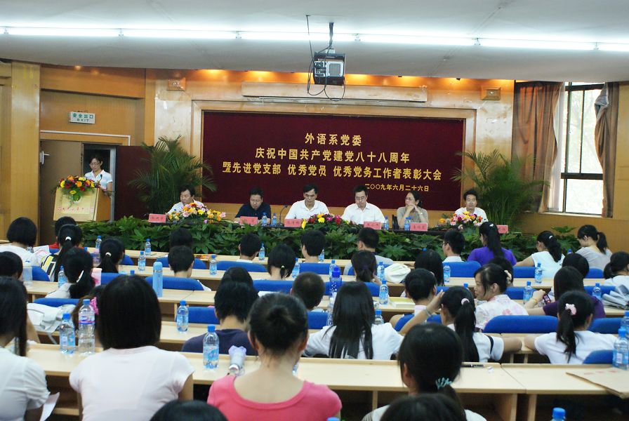 6月26日下午,外语系党委庆祝中国共产党建党八十八周年暨先进党支部、优秀共产党员、优秀党务工作者表彰大会在北校区七号楼二层报告厅隆重举行。系党委委员、各支部书记、教职工党员、学生党员二百余人参加会议。大会由系副主任杨宏同志主持。