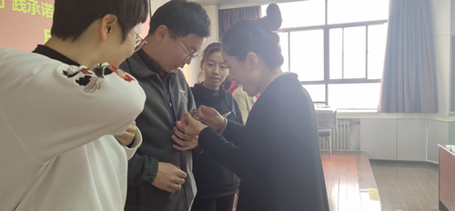 滕艳萍副书记为学生党支部书记、新任支部委员佩戴党员徽章