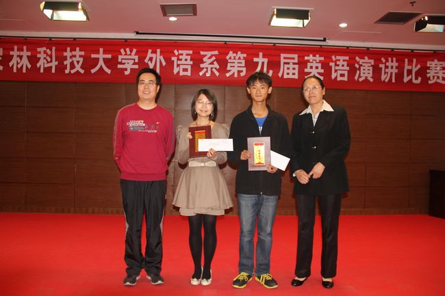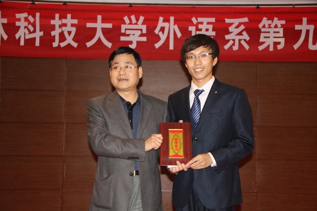 本次比赛采用2011年“外研社杯”全国英语演讲大赛的形式,即:定题演讲、即兴演讲和回答问题三部分。定题演讲题目为: A Word That Has Changed the World。进入决赛的13名学生,用流利的英文阐述了他们的观点。他们以标准的发音、适当的语速、饱满的感情、丰富的表情,给观众带来了听觉和视觉上的享受,赢得了现场热烈的掌声。通过近两个小时的比赛和评委的紧张工作,本次比赛评出一等奖1名、二等奖2名、三等奖3名,优秀奖7名。最终,英语专业093班李首男同学获得一等奖,出席比赛的领导、嘉宾和评委为获奖选手颁发了获奖证书和奖品。