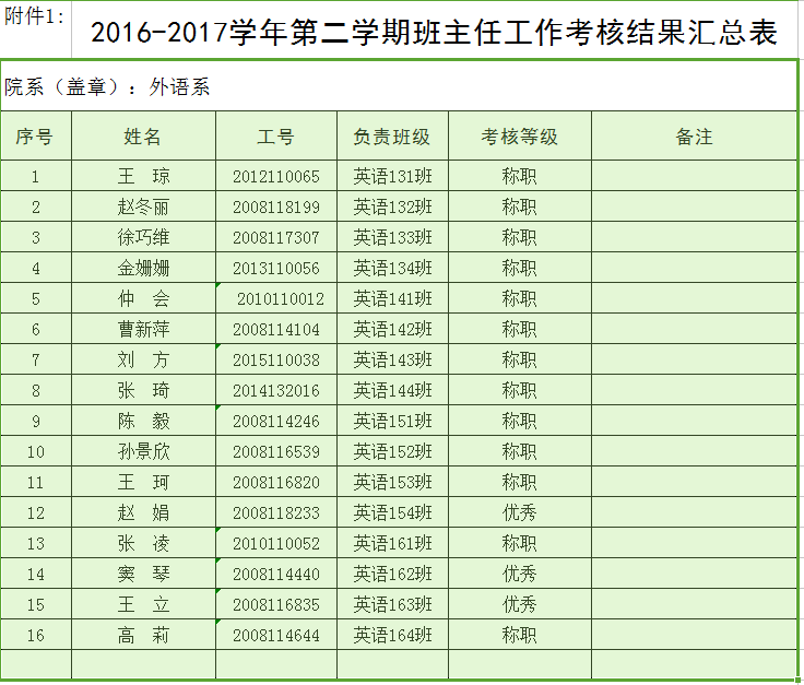外语系2016-2017学年第二学期班主任工作考核结果