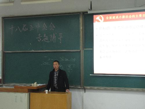 11月12日,马克思主义学院高小升老师以“树立新的发展理念,决胜全面建设小康社会”为主题为外语系180余名本科生全面深入的解读了十八届五中全会精神。