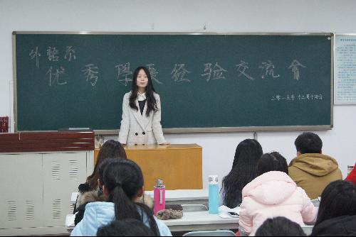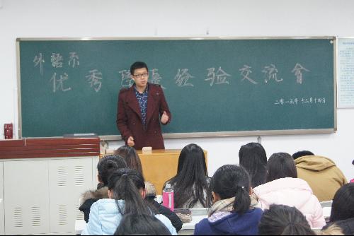 12月14日晚,我系在N8509教室教室举办了题为“你的经验,我的成长——优秀学生经验交流会”活动。我系邀请到了8名优秀学生,包括3名优秀保研学生:推免至中山大学的王杰、中南大学的李晓芸、南京师范大学的张星;3名组织社团活动方面经验丰富的前学生会主席和团工委副书记张建鑫、陈晓阳、梁晓梅;2名专业学习和专业竞赛方面尤其突出的黄克超和秦艺航。外语系辅导员、全体2015级学生参加了此次交流。