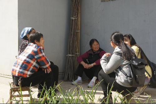 活动中,志愿者们与社区老人们聊天谈心,帮助他们打扫卫生、清理菜地杂草。在与老人聊天时,志愿者们询问了居民们的居住、饮食、医疗卫生及教育等基本生活情况。交谈中,志愿者们了解到:温馨家园小区是由三个村庄在6年前合并组成,由于合并之后居民不再耕种土地,所以小区居民的收入主要依靠子女外出打工所得,小区内基本上都是老人和儿童,老人们平日里主要是照顾小孩,有些老人还通过担任环卫工人来补贴家用,有的老人则在小区的空地上开垦出一片菜地,种上各种各样的菜来供大家分享,社区之间邻里非常和睦。