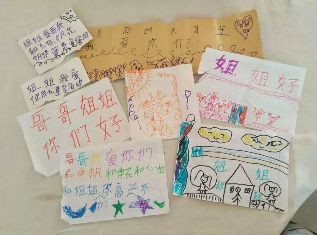 简陋的教学设施,并没有抹杀孩子们的热情。慢慢地,越来越多的孩子过来了,队长组织每个队员和孩子们进行自我介绍。渐渐的,和孩子们玩熟以后,孩子拿出了他们的礼物,一幅幅画着我们和他们自己牵着手的画,还写着“欢迎哥哥姐姐们”几个彩色的字。好大的一个惊喜,这样的礼物让队员们开心之余都更有信心坚持接下来的支教生活。