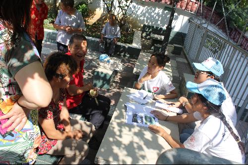 队员们在树下与敬老院的老人们聊天