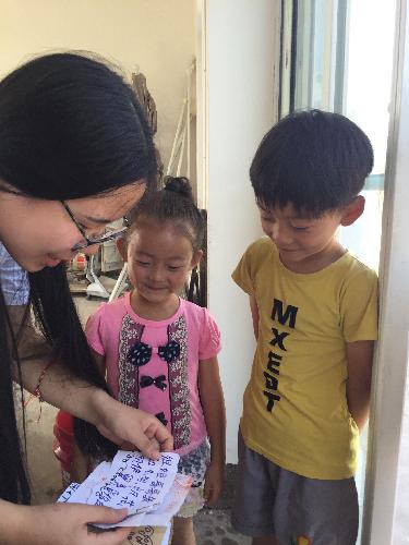 阳光从云中一角挣脱而出,微风卷着鸟鸣吹进教室。所有小朋友都安安静静地坐在椅子上,或是自己练习生字,或是由队友辅导完成假期作业。突然一份份纸条的递到队员身边,上面写着“哥哥姐姐我爱你们”,画着太阳和大小不一的人。这些大大小小,花花绿绿的纸条打开后都化为了一颗颗被队员吃掉的带着小朋友爱的甜蜜糖果。