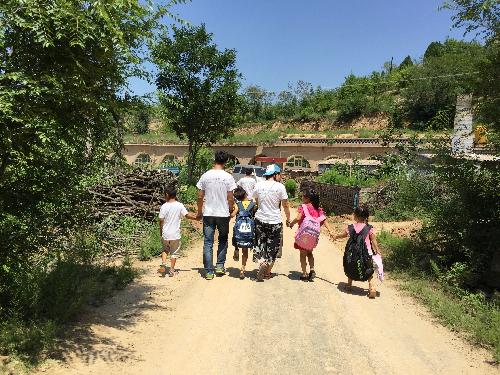 支教课堂里的小学生们都住在碾畔村,从碾畔村至支教地点的路全部为山路,清晨,支教服务队的队员们徒步近3公里行至碾畔村,走入每一个学生的家里,再行走2公里,将学生们安全护送至支教中心。在放学后,支教队的队员们再将学生们一一送至家中。延川县高温天气常见,为了保障学生们不中暑,支教队队员们在路上还为他们打太阳伞,擦汗。支教队队员们所做的这一切,都是希望学生们能够开开心心的去上学,安全快乐的到家。