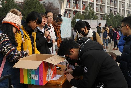 活动现场非常火爆,正能量爆棚,在场的工作人员都忙的不亦乐乎。他们很多都是刚下课就赶赴到活动现场,在社会实践部部长的安排下,各位志愿者明确了自己的分工,马上到自己的工作岗位上“奋斗”起来。志愿者们个个都充满了活力,积极地参与到活动当中。负责宣传的志愿者利用音响使劲地吆喝着;负责引导的同学,在人群中穿梭,引领着越来越多献爱心的同学们到捐赠现场;负责解说的同学,向现场的同学们解说着募捐的注意事项……志愿者们都忙得热火朝天。中午正值同学们下课时期,前来捐赠物资的人越来越多,而社会实践部志愿者们虽然忙得不可开交,却都兴致勃勃地做着自己的工作,完全没有懈怠之意。志愿者们为了更好地为同学们服务,放弃了自己吃饭和休息的时间,坚守在自己的岗位上。虽然寒风在吹着,但活动现场的气氛是热烈的,志愿者们的心也是热的,她们并没有停止自己争取更多爱心人士参与到募捐活动中来的脚步。社会实践部的志愿者们用行动感染着在场的每一位同学,他们纷纷前来捐赠,奉献自己的一份爱心。