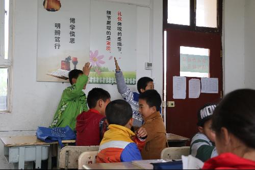 早上九点,支教活动正式开始,志愿者分为两队,一队负责辅导二三年级的学生,了解他们的学习情况,为他们答疑解惑,帮助完成家庭作业中的难题,同时复习巩固已经学过的知识,引导预习新一周将要学习的知识,志愿者们十分耐心,认真回答孩子们提出的每一个带着稚气的问题,态度认真且不敷衍。另一队志愿者则分散到数学班、英语班和美术班听课,了解中心小学的教学模式和老师的教学方法,以便用学生熟悉的教学方法来讲解知识点,使他们更易接受和吸收。同时,也使支教活动能够最大程度的发挥出其传递知识的作用。