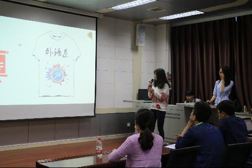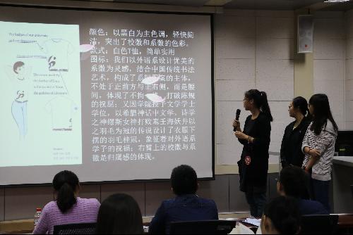 6月5日晚,决赛于外语系7501教室举办,园林学院副教授李志国、外语系团工委书记刘方、辅导员尹传松担任本次比赛的评委。大赛秉承公平公开的原则,由抽签决定选手出场顺序,经选手解说、展示图样后,评委据其设计理念、实际用途、作品形象等方面予以打分。比赛中,选手们展示了风格多样、别出心裁的作品,文字图案的完美结合,简明扼要的设计理念,深刻的寓意蕴含其中。一号选手王勇只将桥梁元素加入系服设计中,寓意外语系学子努力成为中西文化沟通的桥梁。四号选手陈洁设计了各国标志性建筑的剪影,表达我系学子走向世界的梦想。九号选手韦渊别出心裁地将我系微信二维码加入系服中,增强了系服的实用性,令人耳目一新。十八号选手刘雅琦将苏格兰格子元素与学院风融合,吸引了全场的关注,其精彩的解说赢得了阵阵掌声。