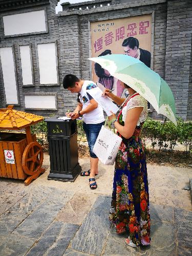 许多游人在树荫下歇脚纳凉,我们便走上前去邀请他们帮我们填写问卷。一开始我们接连两次遭到拒绝,但这并没有浇灭我们的信心与热情,终于在我们分发问卷的过程中遇到了许多温暖的人。一位爷爷带着老花镜,眼睛有些看不清,还是很认真的帮我们填写了问卷,这项工作进行的越来越顺利,我们一天发出了二十份多问卷。在白鹿仓第一天的成功给予了我们极大的鼓舞,相信我们的坚持与努力一定会得到回报,明天的调研工作也一定会如今天般顺利,不辜负我们的汗水与付出。