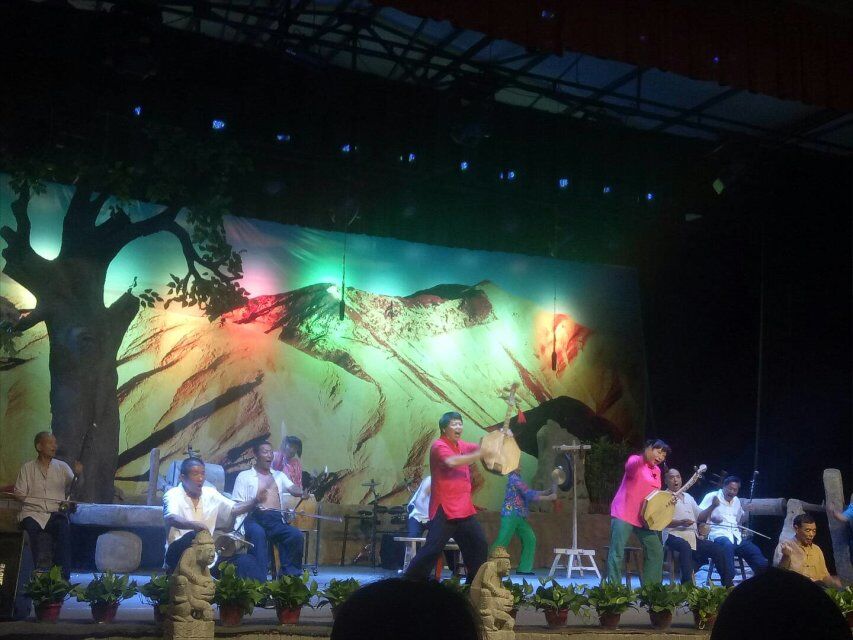 在张老先生首位女弟子张香玲女士的帮助下,我们有幸进入华阴古乐剧场观看老腔演出。“将令一声震山川,人披衣甲马上鞍,大小儿郎齐呐喊,催动人马到阵前……”雄浑壮阔的声音当真让人为之惊叹,没有优美的语调,有的只有充满乡土气息的嘶吼,偏偏就能触碰到脑海中的一根弦,让人欲罢不能。这种感觉与《白鹿原》的影评的“靠着月琴、胡琴、自制的梆子、钟铃甚至还有一张长条凳和那几句包裹着千军万马的唱词,听的人从心底热血沸腾,真的烈。”着实相似。那犹如百万秦军复活的气势,那一句句惊心动魄的唱词,当真犹如古秦军在沙场上喊得“赳赳老秦,复我河山,血不流干,死不休战。”