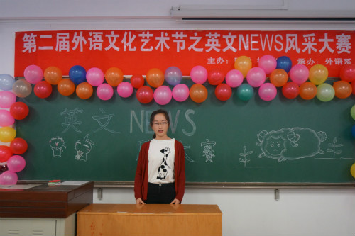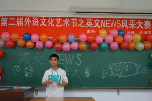 5月8日,第二届外语文化艺术节之校园英文NEWS风采大赛初赛在北校区8109教室顺利举办。本次比赛评委由我系陈音稳老师、张鹏老师和曹新萍老师担任,共有16名选手参与初赛角逐。