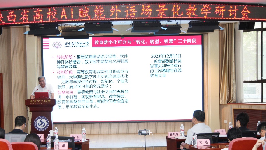 随后,西安电子科技大学的杨跃教授分享了名为“数字化转型背景下外语教学的新生态”的报告。杨教授强调,数字化转型是社会进步的必然趋势,介绍了知识图谱在外语教育中的应用,特别是AI数字人在知识传递和共享中的重要角色。他以西安电子科技大学《新通用大学英语》课程的建设为例,详细阐述了该课程在智能技术辅助教学中的创新实践。