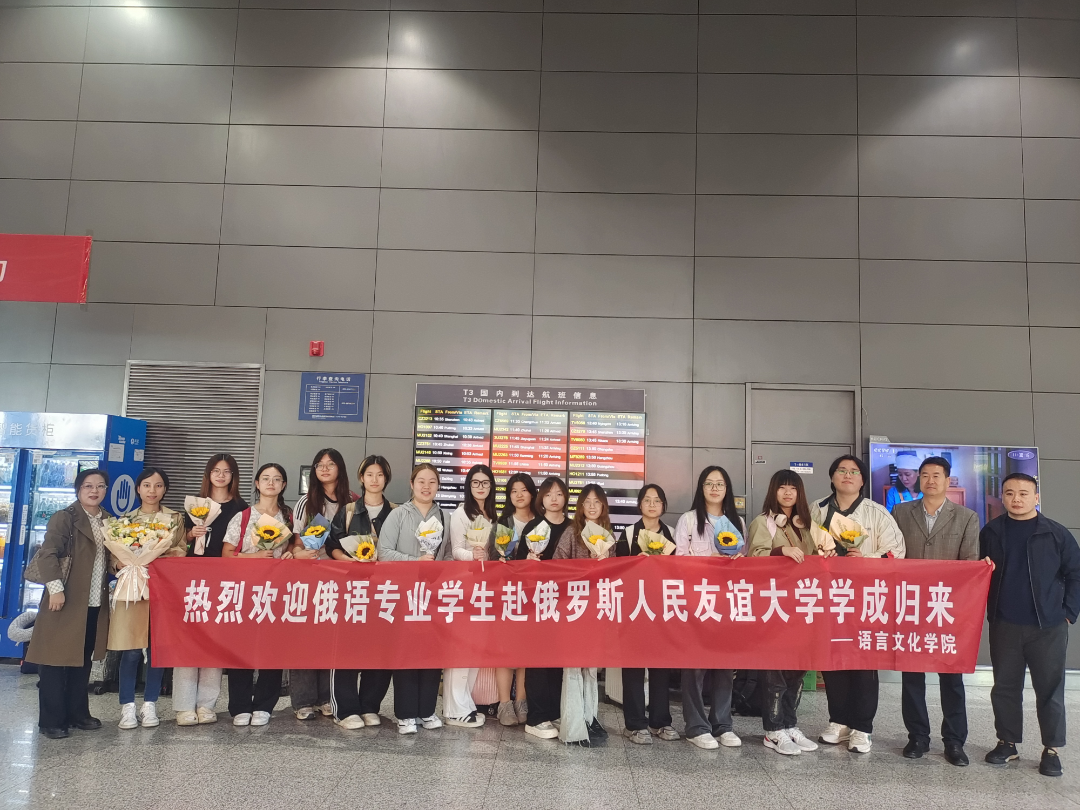 10 月 9日,学院俄语专业的13位同学结束了在俄罗斯莫斯科俄罗斯人民友谊大学为期三个月的访学之旅,顺利返回。学院田志强副院长、王宝平副院长、张善之主任前往机场接机。